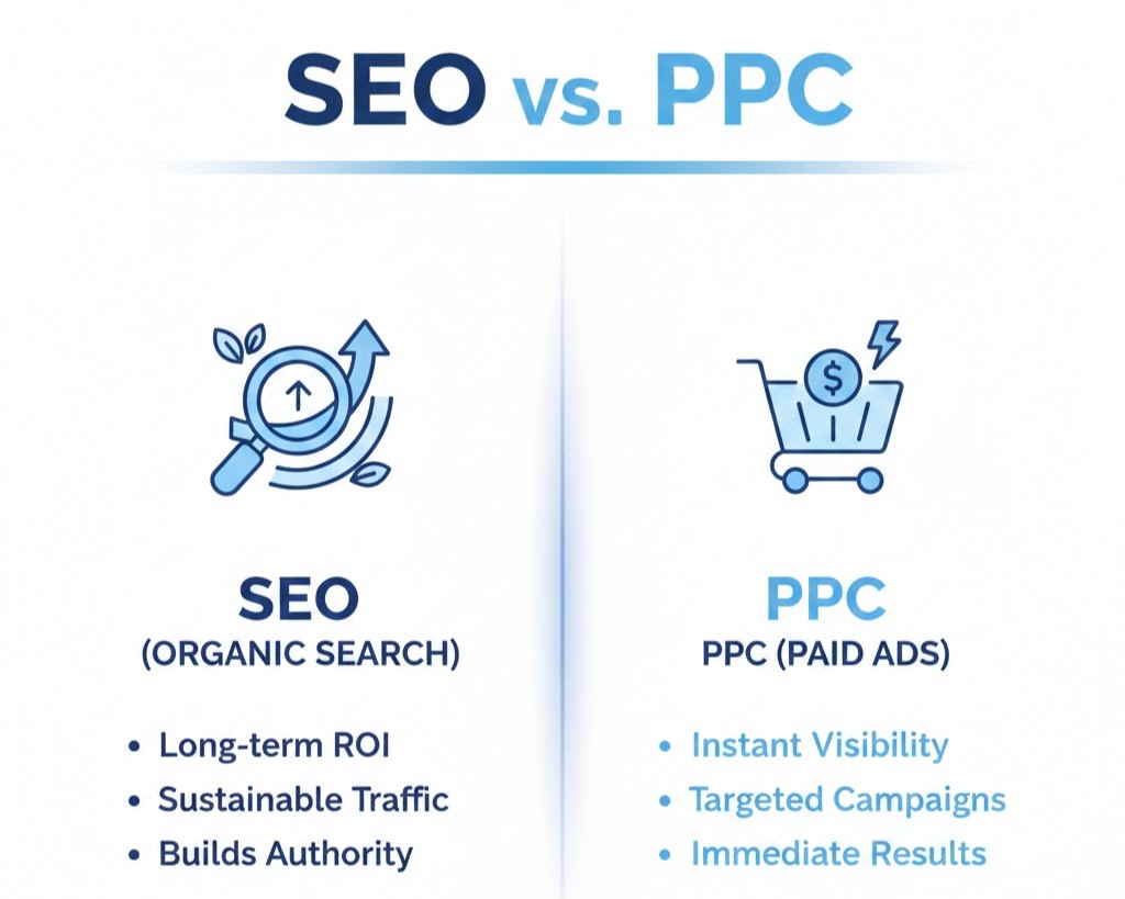 Think of PPC as the “fast lane,” while SEO is the “long-run engine” of your online growth. Choose the right approach by aligning your strategy with your business goals.